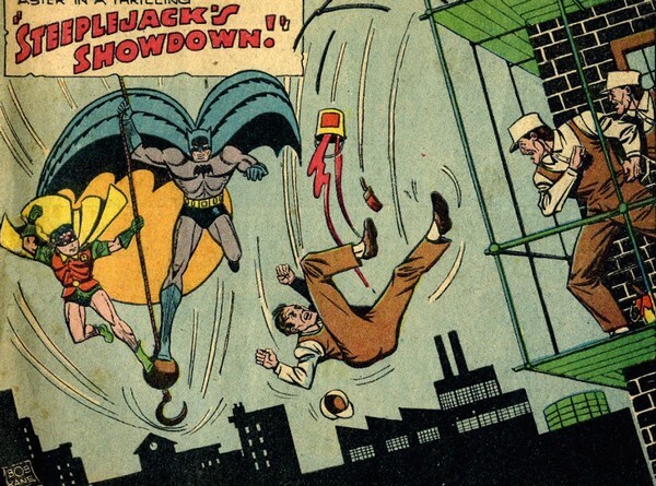 В комиксе Detective Comics #117 Бэтмэн и Робин вновь впрягаются за честных работяг. В центре внимания Боб Скелли, глава компании, занимающейся высотными работами, промышленным альпинизмом. В последнее время зачастили преступления с использованием оборудования компании, и Боб решает взять ситуацию под контроль, ну и связывается заодно с Бэтмэном и Робином на всякий случай. При этом Боб решает лично принимать участие в работе своей бригады, а то что это такое, работяги жизнью на высоте рискуют, а он пылится в офисе сраном. И-и-и прораб его бригады, Логан, оказывается той ещё говной и решает от босса избавиться, чтобы не мешал использовать высотное оборудование для обворовывания квартир на высоких этажах. Динамическому Дуэту чудом удаётся спасти Боба от рокового падения. Боб не в курсе, что это была попытка убийства (Логан не муаххахакал вслед), а потому решает продолжить работу с бригадой, только сам на верхотуру уже лезть не рискует.
