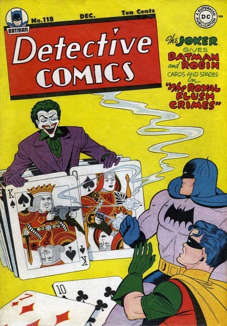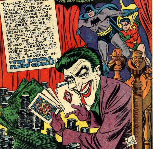 Но кому нужны ноунеймы, когда есть враги именитые? Милости прошу в комикс Detective Comics #118. Джокер задумал новую серию преступлений, и их темой станет покер в целом и комбинация “Флеш-Рояль” в частности! В первую очередь банда грабит ювелирку и оставляет в качестве пасхалки карту, десятку бубен. Брюс Уэйн и Дик Грейсон читают об этом в газетах, но гражданскую жизнь Динамического Дуэта никто не отменял, так что они спокойнёхонько идут на встречу с давним другом, спортсменом, отставным бейсболистом по прозвищу “Бриллиантовый Джек”. И тот сообщает, что какой-то пранкер тайком вручил ему карту, бубнового валета. В тот же день банда Джокера угоняет броневик инкассаторов и устраивает погром на стадионе для бейсбола (традиционно бейсбольное поле называется “ромб”, то есть, Diamond). Бэтмэн и Робин немного накидывают бандитам по голове, но тем удаётся сбежать, ограбив кассу.