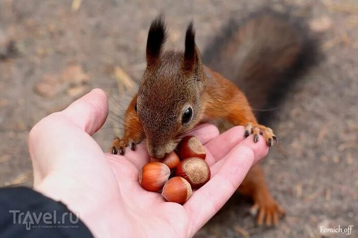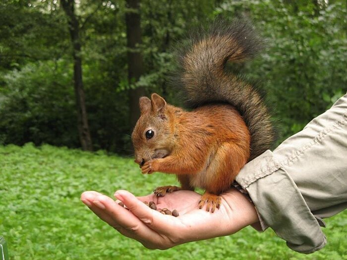 А зря. Есть как минимум три причины не кормить белок, и тем более не давать делать это детям. Первая – белка непредсказуема. Не ведитесь на ее безобидный вид, помните о зубах, разгрызающих орехи и шишки. Пальцы намного мягче.