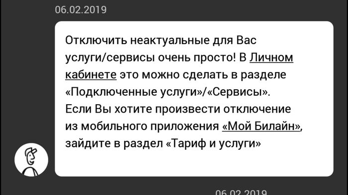 Захожу в подключённые услуги. Платных нет. Пишу в поддержку, отвечает робот, что есть, отключить через список услуг в мобильном приложении или через комп в соответствующем разделе