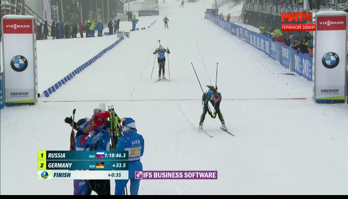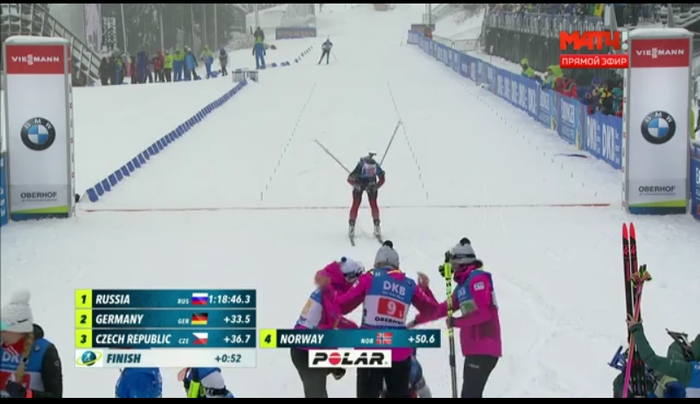 Спринтерская гонка прошла в субботу. Изначально весь пьедестал почета заняли российские биатлонисты - Александр Поварницын, Никита Поршнев и Эдуард Латыпов соответственно.