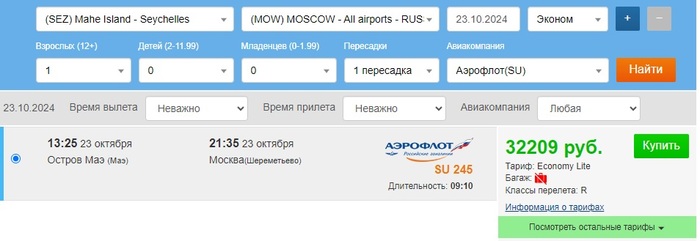 Итого, мы получаем прямой билет Аэрофлота за 37810 руб. вместо 65500 руб., по которой они продаются на офиц. сайте Аэрофлота. Скажу так, для Сейшел цена в 37к за прямой перелет на неделю - это жир. Более того, обратные билеты упадут ближе к дате вылета по цене еще ниже раза в 2, но, возвращаясь к нюансу...