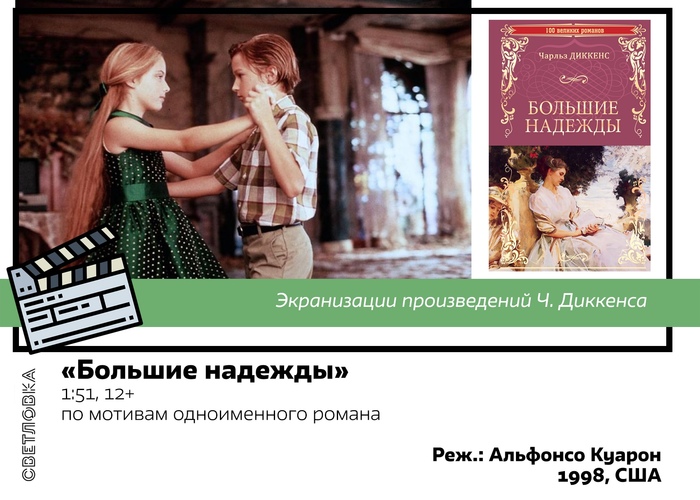 Эта экранизация «Больших надежд» переносит действие в настоящее. Сюжетная ветка значительно упрощена, но не лишена своей атмосферности благодаря работе режиссера Альфонсо Куарона. Как всегда, советуем познакомиться и с оригиналом, и с экранным воплощением истории.