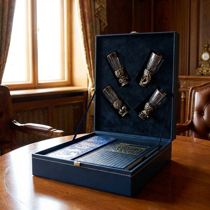 Набор ориентирован на любителей рыбалки и мужских увлечений, объединяя тематическое содержание и подарочное оформление. Центральным элементом выступает «Большая книга русской рыбалки», посвященная традициям и практике рыбной ловли. Издание выполнено в переплете ручной работы из натуральной кожи. Книга имеет крупный формат 250×312 мм и объем 360 страниц на русском языке. Подарочная упаковка представляет собой коробку с прошивкой, замком и ложементом. Используются материалы картон и эко-кожа armonia. Комплект воспринимается как тематический коллекционный подарок.