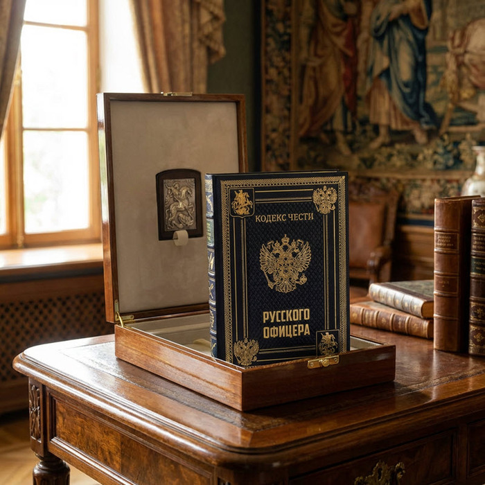 Издание посвящено офицерской чести и включает «Советы молодому офицеру» Валентина Кульчицкого, «Дуэльный кодекс» В. Дурасова и повесть А. С. Пушкина «Выстрел». Книга раскрывает историческое понимание достоинства, долга и воинской традиции Российской империи. Набор дополнен иконой «Св. Георгий Победоносец». Книга выполнена в цельнокожаном переплете ручной работы с золотым тиснением и блинтом, обрез покрыт золочением. Используются богато оформленные дублюрами составные форзацы и шелковое ляссе. Икона выполнена методом гальванопластики с серебрением поверхности в сочетании с деревянной основой, ляссе из шелковой ленты. Все размещено в лакированной шкатулке, покрытой рояльным лаком и украшенной золотым гербом из металлостикера.