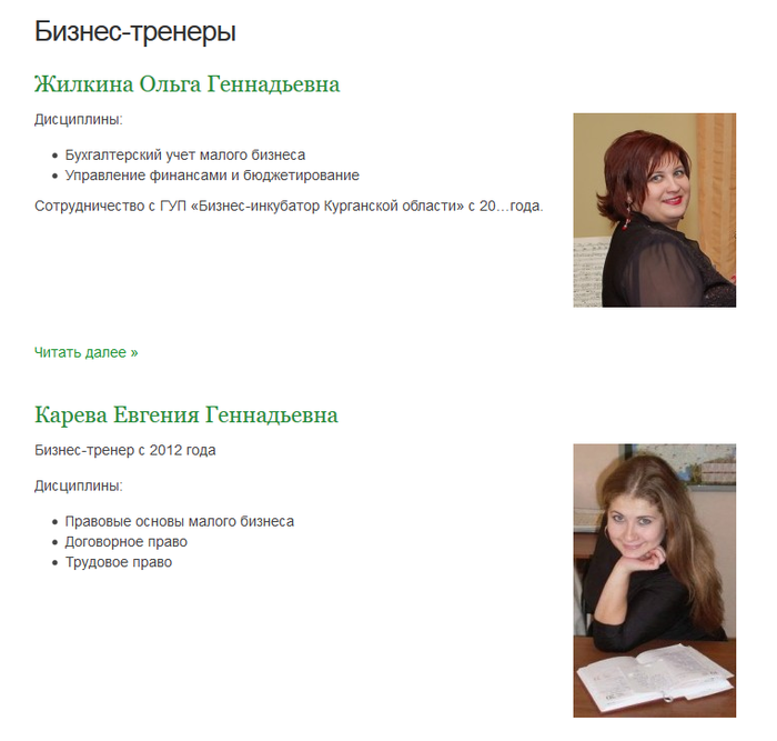 Предприятие располагает штатным списком бизнес-тренеров, их имена опубликованы на сайте инкубатора. Например, в их числе есть Жилкина Ольга Геннадьевна и Карева Елена Геннадьевна, запомните эти фамилии, в будущем они ещё всплывут в этом тексте.