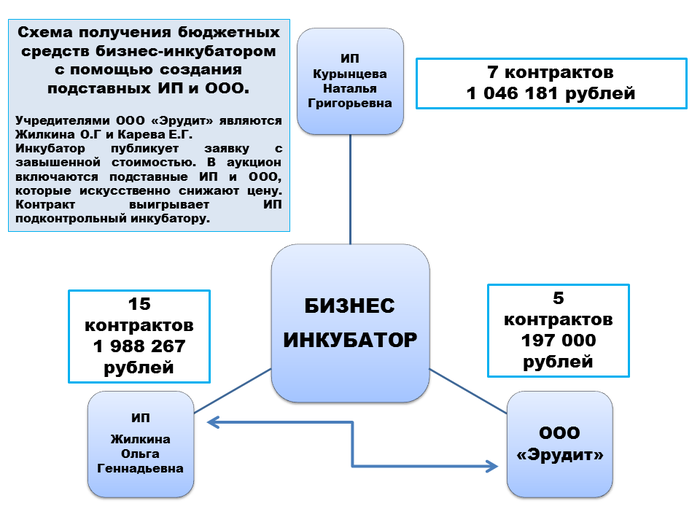 А сейчас о серой схеме. Например, Бизнес-инкубатор создаёт закупку на получение определенных услуг, стоимость 100 тысяч рублей. Заявляется три компании из разных регионов. Выигрывает компания из Челябинска и деньги уходят в соседний регион. Приезжает человек, оказывает услугу и уезжает. Инкубатор остаётся с носом, пока им в голову не приходит идея самостоятельно выигрывать тендеры через аффилированные и подставные ИП и ООО. Так, появился ИП Жилкина О. Г., ИП Курынцева Н.Г. и ИП Яковлев А.В. Все они являются штатными тренерами инкубатора. Связка Жилкина и Карева образуют ООО «Эрудит», которые также принимают участие в закупках.