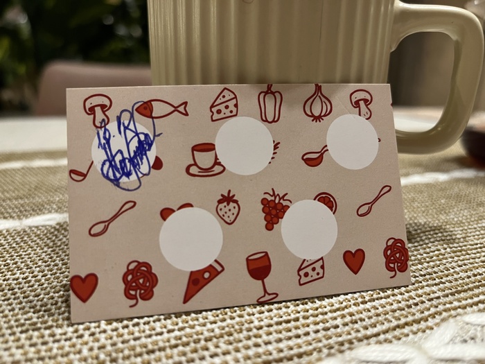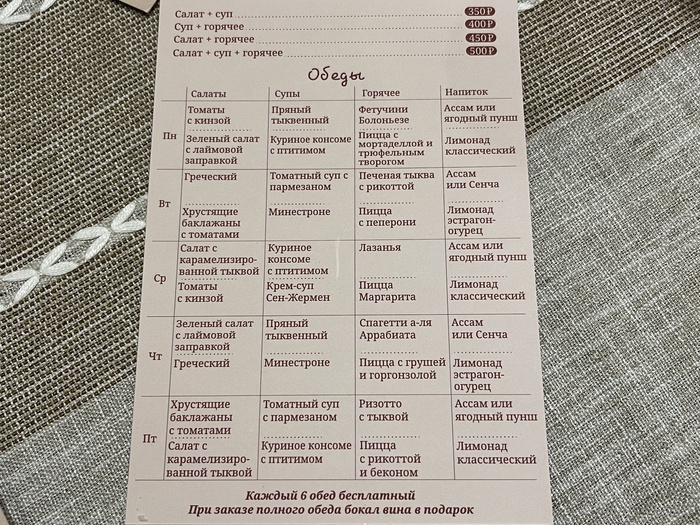 Как и в целом весь обед – мне кажется, он ответил на повисшие в воздухе вопросы. По крайней мере, лично мне кажется, что это достойное решение для делового обеда в центре столицы. Если столоваться в Porta Rossa регулярно, можно получить бонус – шестой обед бесплатно. Мне выдали такую карточку лояльности с отмеченным первым визитом.