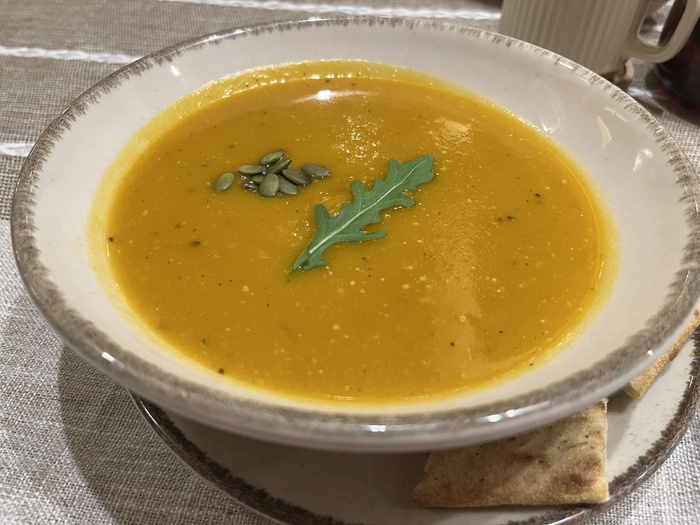 На первое – пряный тыквенный суп. Подаётся с двумя треугольниками фокаччи в качестве хлеба. Объём приличный.