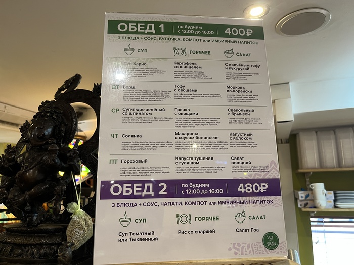 Действительно, бизнес-ланч в зависимости от комплектации стоит от 350 до 500 рублей. Каждый день недели – определённый набор блюд, на выбор два варианта.