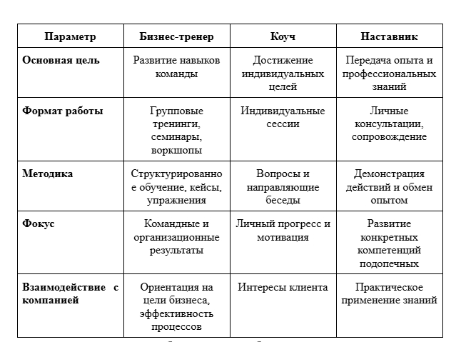 Бизнес-тренера, коуча и наставника часто путают, но между ними есть существенные различия. Первый работает с группами, структурирует образование и фокусируется на командных и организационных результатах. Второй концентрируется на индивидуальных целях и мотивации. Третий делится опытом и помогает применять знания на практике.