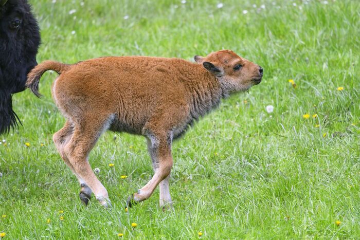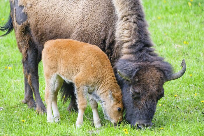 Бизон-мама только что родила этого малыша. Как только телёнок смог вставать и ходить, мать повела его в стадо. Они должны быть со стадом в целях безопасности от гризли и волков.