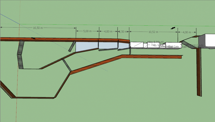 Вот ещё реальная задача: Раскол для разбивки поголовья диких животных на мелкие группы вплоть по одному. Есть некоторые проекты этого здания, где работают на втором этаже, англичане ещё называют эту антресоль - cat walk. Задача такая, чтобы дверь можно было открывать, закрывать и фиксировать в обоих положениях сверху и снизу, находясь по обе стороны загона. Дело в том, что это не очень удобно, когда ты внизу в полном контакте с крупным рогачом, а твоя жизнь и здоровье зависит от расторопности человека сверху, успеет он открыть тебе дверь или нет. Я предлагал такой раскол на нескольких фермах и в некоторых местах не стали думать. Просто работают сверху и все засовы заточены именно под второй этаж. А когда спускаешься вниз, то приходится стучать по двери дабы оператор сверху мог понять какую дверь дёргать и в какую сторону. Ну а так, посидел подумал и вот форма засова для фиксации дверей.