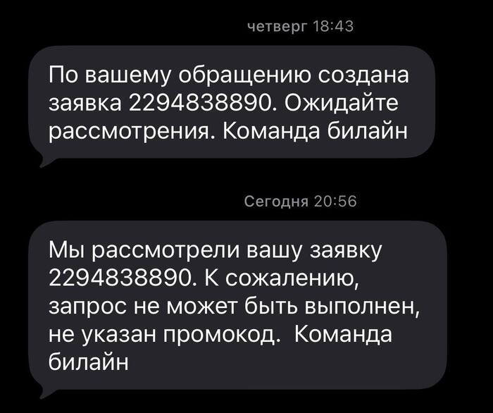 Очень странно. Звоню на горячую линию, где меня перекидывают по 10 раз и вот, наконец-то я попадаю на адекватного сотрудника, который обещает, что 25 декабря промокод придет. Но ни 25, ни 26, ни 27 и ни даже 28 декабря промокода нет. Зато есть вот такая замечательная SMS: