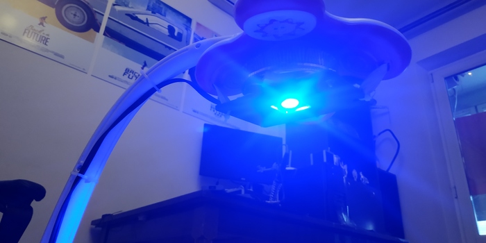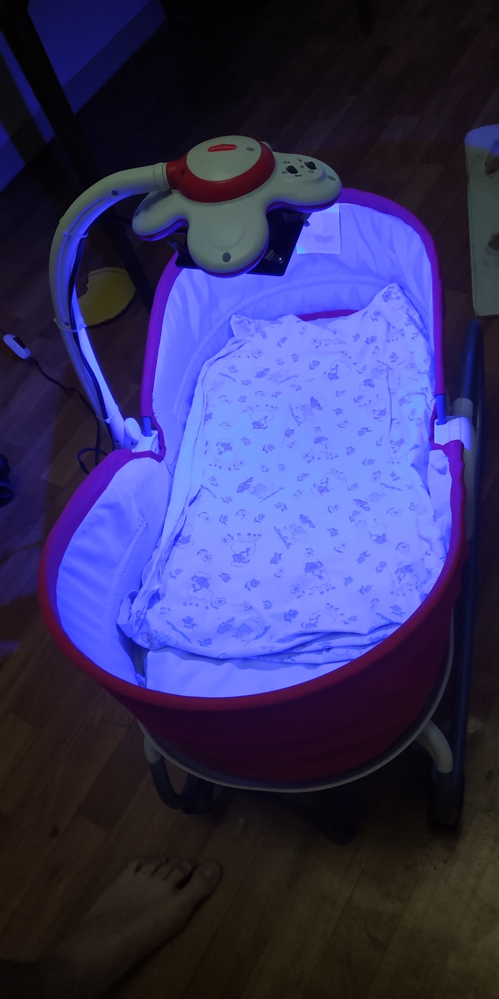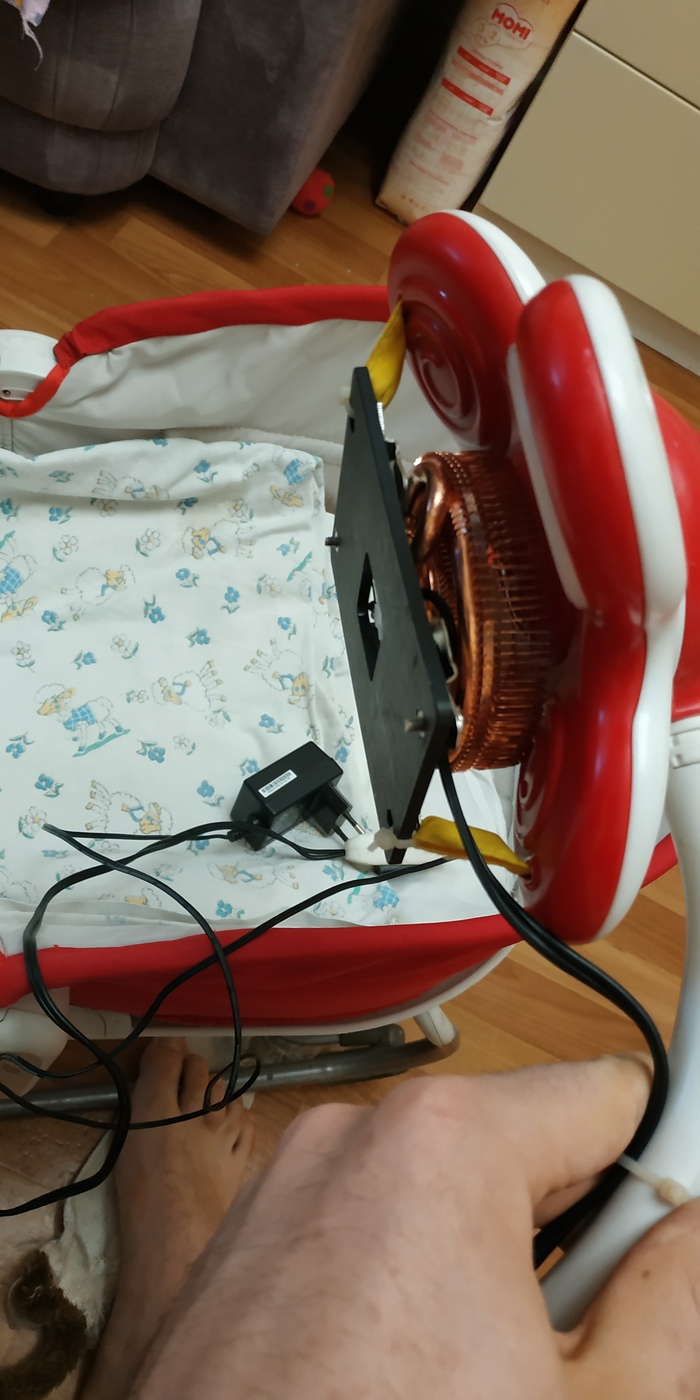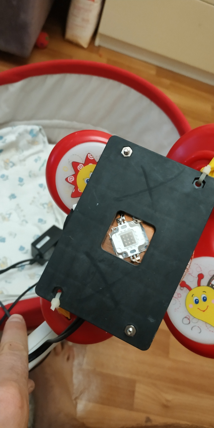 Как видите по фоткам приколхозил эту штуку к мобилю в люльке на стяжки, высота порядка 50см. Остался вопрос с защитой глаз и окружающих, пусть 450нм это не ультрафиолетовый диапазон, но приятного смотреть на такой свет мало. Проблема решилась пушистым одеялком, посреди одеяла прорезал дыру, натянул на пластиковую оправку радиатора и прижал стяжкой, получиться шатер, за счёт волосатой текстуры одеяла свет наружу почти не проходит.