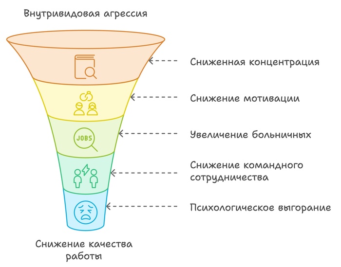 Harvard Business Review выявил, что сотрудники, сталкивающиеся с агрессией, теряют до 6,19 часов в неделю на обсуждение проблем, связанных с конфликтами на рабочем месте, что снижает продуктивность почти на 15%.