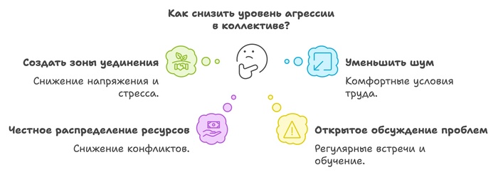 Чтобы снизить агрессию и её негативное влияние на работу, важно создать комфортные условия и поддерживать атмосферу уважения: