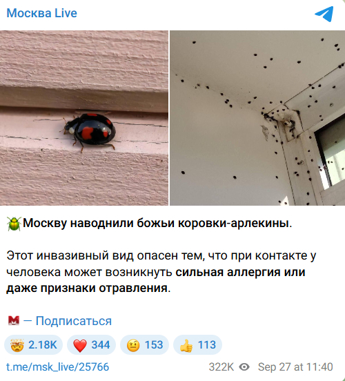 В Сети пишут, что Москву якобы наводнили божьи коровки-арлекины — опасный вид насекомых, которые при контакте с человеком могут вызвать сильную аллергию или даже признаки отравления.