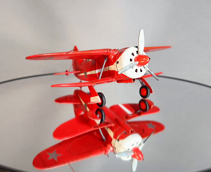 Представлена модель монобиплана ИС-1 с выпущенными шасси и нижним крылом во время испытательных полётов, лето 1940 года, СССР. Модель фирмы Amodel с доработками, масштаб 1/72.