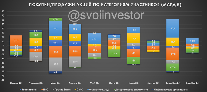 💬 Основными покупателями на российском рынке акций в октябре стали физические лица — 13,3₽ млрд (в сентябре — 43,1₽ млрд), физики начиная с февраля совершают покупки (вера в "казино" продолжается), к продажам вернулись СЗКО — 2,9₽ млрд (месяцем ранее они купили бумаг на 18,9₽ млрд). Крупнейшими продавцами стали вновь НФО ДУ — 9,6₽ млрд (в сентябре — 17,6₽ млрд).
