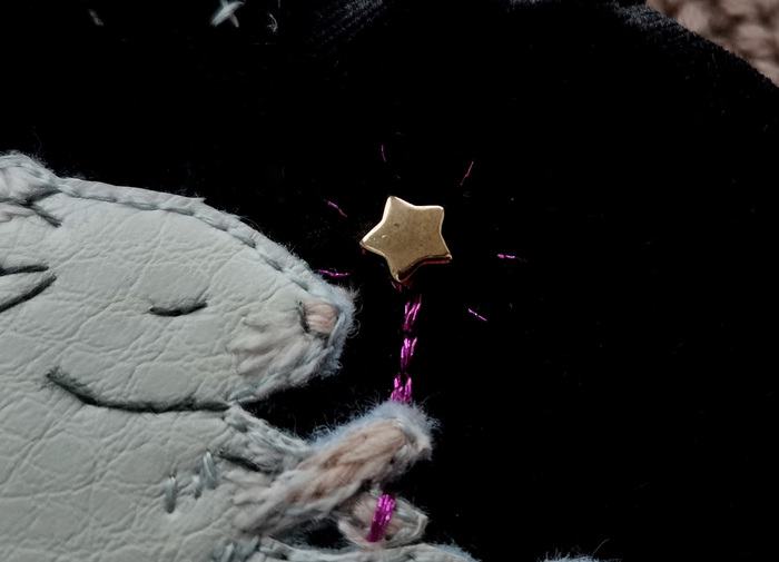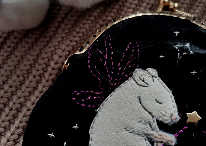 Выполнен из бархатной ткани. Мышка из искусственной кожи с вышивкой на разных частях. Крылья и волшебная палочка вышиты металлизированными нитками. Хвост из бисера. Размер 8 на 12 см.