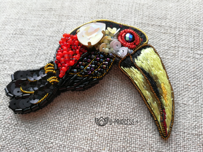 4. Красногрудый тукан (Ramphastos dicolorus). На грудке бисер, пайетки и кристалл Сваровски из новой коллекции - оттенок близок к белому, но под определённым углом видны оранжевые всполохи внутри.