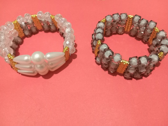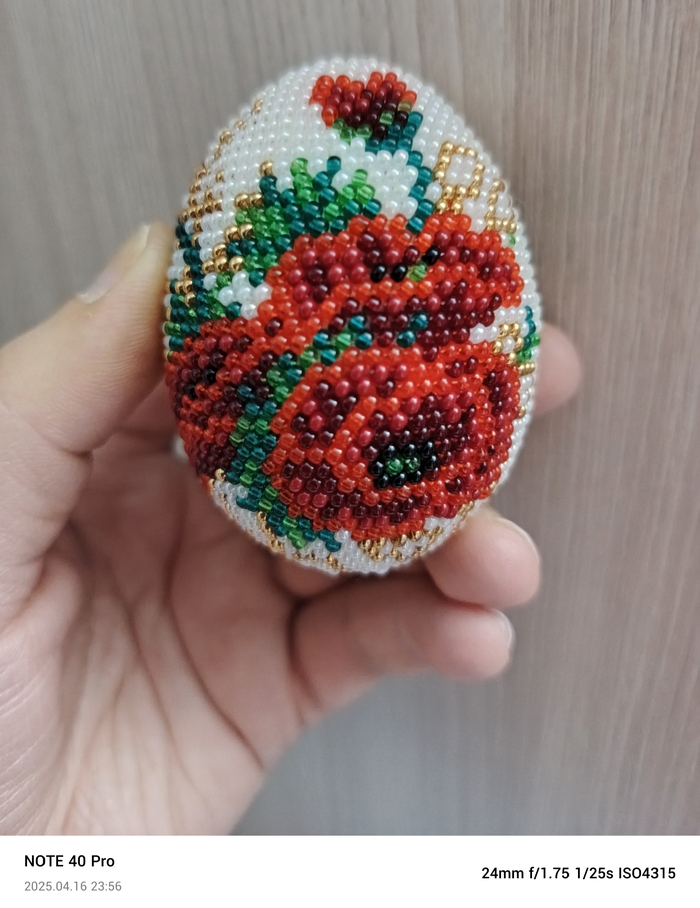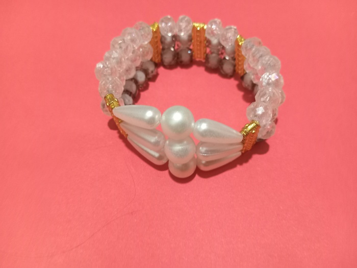 Выполнен из ювелирного бисера с покрытием золото 24 карата и персиковый сатин