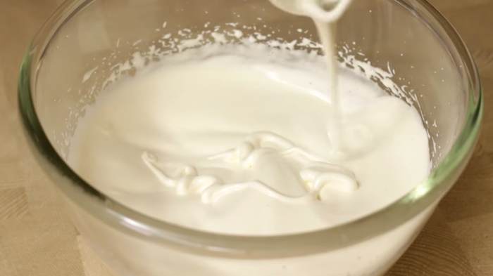 Пена должна стать густой, светлой, когда начнут оставаться следы от венчиков миксера уже достаточно взбивать.