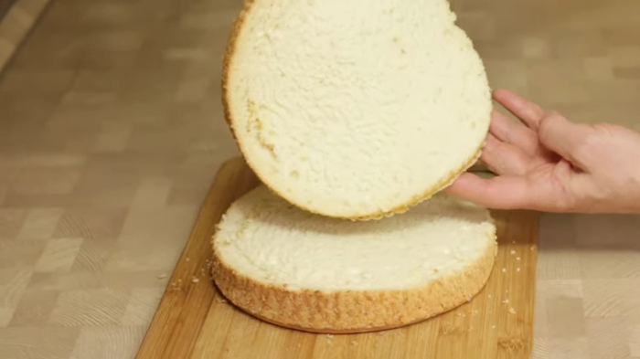 Наш бисквит уже полностью остыл и мы разрезаем его специальным ножом на 3 коржа. И будем собирать торт.