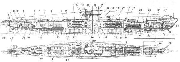Под палубой находились носовые аккумуляторные ямы, баллоны воздуха высокого давления и артиллерийский погреб.
