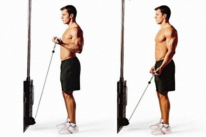 С верхнего блока удобнее всего работать в кроссовере, одновременно сгибая поднятые на уровень плеч руки, либо сгибать руки без супинации с канатом (проработка брахиалиса):