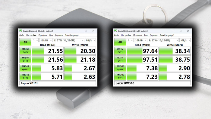 Разъемы USB-A маркированы как 3.0, но в действительности же это, естественно, 3.2 работающие на скоростях до 5 Гбит/с. Чтобы не запутать читателя, сейчас это самый обычный базовый USB третьей версии. Скорость чтения не самый быстрой флешки хаб Rapoo XD101 не ограничивает. Бенчмарк показывает одинаковые результаты и для флешки подключенной через хаб и для этой же флешки подключенной напрямую к материнской плате.