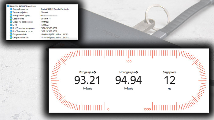 При использовании сетевого порта нужно иметь в виду, что он поддерживает скорость до 100 Мбит/с. Тестирование в «Интернетометре» подтверждают заявленные скорости. Для офисных задач и стабильного видеозвонка этого вполне достаточно, но для быстрой перекачки огромных файлов по локальной сети этого может быть мало. Впрочем, далеко не все локальные сети работают на скорости 1000 Мбит/с, а уж интернет и подавно. Поэтому такой скорости должно хватить чуть меньше, чем всем.