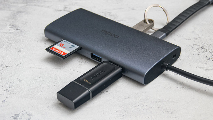 В процессе эксплуатации Rapoo XD101 ведет себя предсказуемо и не требует установки специальных драйверов на современных операционных системах. Стоит учитывать, что порт USB-C здесь предназначен исключительно для зарядки ноутбука по протоколу PD 3.0 с мощностью до 100 Вт, передавать через него данные или видеосигнал не получится. То есть, блок питания ноутбука (если он заряжается по USB-C) втыкаем в хаб, а хаб втыкаем в ноутбук. Питание от розетки идет, соответственно, сквозь хаб к ноутбуку. Получается, разъем питания ноутбука, хоть и занят хабом, но остается таким же функциональным.