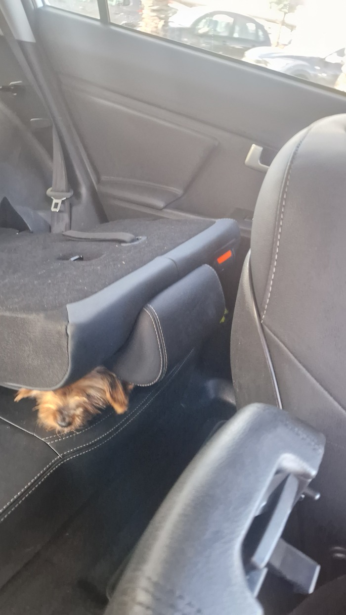 Его рваная манера движения таки заимела плоды, заднее сидение оказалось не зафиксировано и псину накрыло