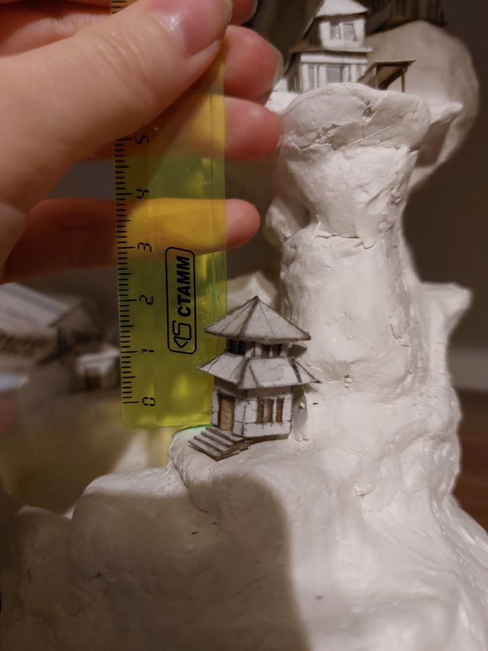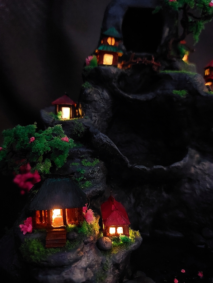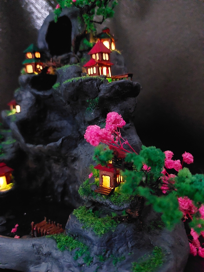 Да, в этот раз я заморочилась основательней и, поскольку не хотелось делать ну прям совсем вот что-то, что и в прошлый раз, решила опять поэкспериментировать и добавить подсветку. Тут у меня и начала прорисовываться в голове концепция: это должна быть азиатская горная деревушка, а в окнах домиков свет.