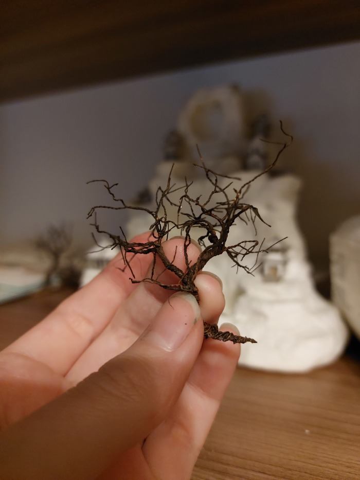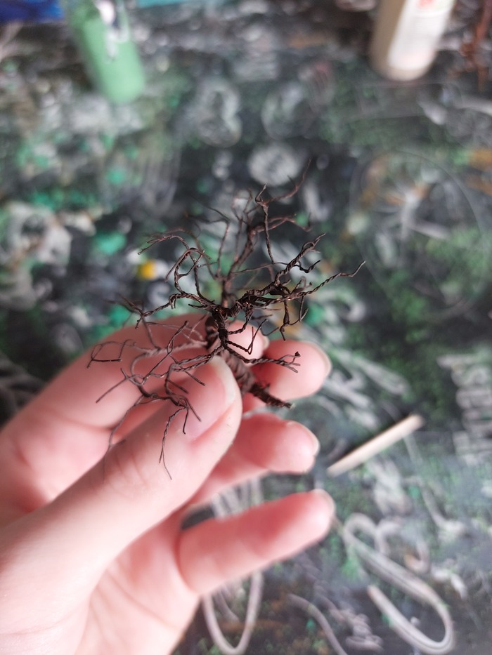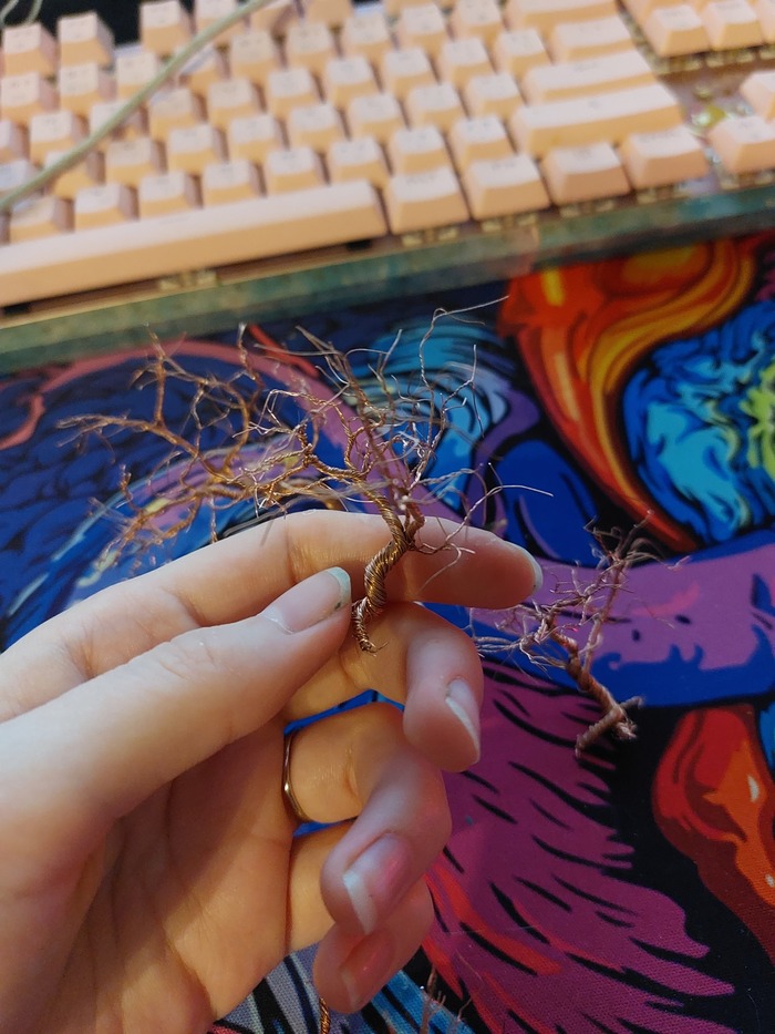На этом проблемы не закончились, ведь нужно же ещё сделать ствол дерева, а для этого нужна проволока. Очень-очень тонкая. Моя наивная душа полагала, что в любом бытовом или строительном магазине есть проволоки на любой размер и цвет. Кааак же я ошибалась. Везде на меня смотрели как на дурочку и говорили, что таких тонких не существует. А я не понимала как так: я ведь точно в детстве видела у дедушки тонкие медные проволоки и воровала их для бисероплетения. В общем, пришлось дома просить пожертвовать для меня провод и раздербанить его. Мне пояснили, что это вообще-то медной жилой называется, а не проволокой. Впрочем, мне было до лампочки, мне надо было крутить деревья! И это занятие мне уже пришлось по душе.