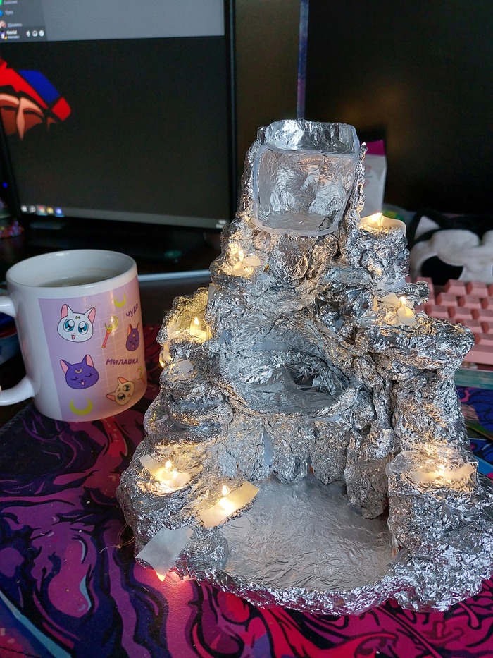 Там как раз пришла гирлянда, которую я внедрила в этот каркас. Боялась, что где-то я её порву, пока пихаю через дырочки или что она замкнёт из-за фольги (такое бывает вообще? Я в физике полный 0). Но всё работало как надо и мои опасения не подтвердились.