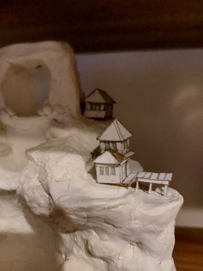 Эта работа мне нравится определённо больше, чем предыдущая, хотя меня не очень устраивает то, как я подобрала цвета. Домики будто сливаются с горой. Плюс, есть определённые косяки, например, я так и не придумала, как мне красиво заделать блок с батарейками и просто вложила его в футлярчик из фольги со стороны дна.