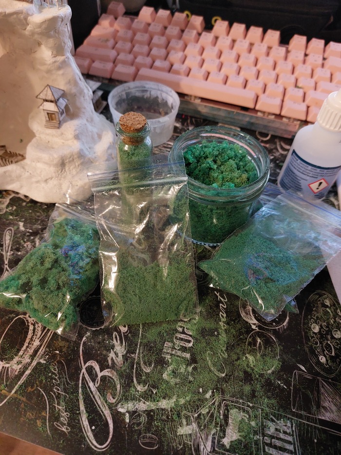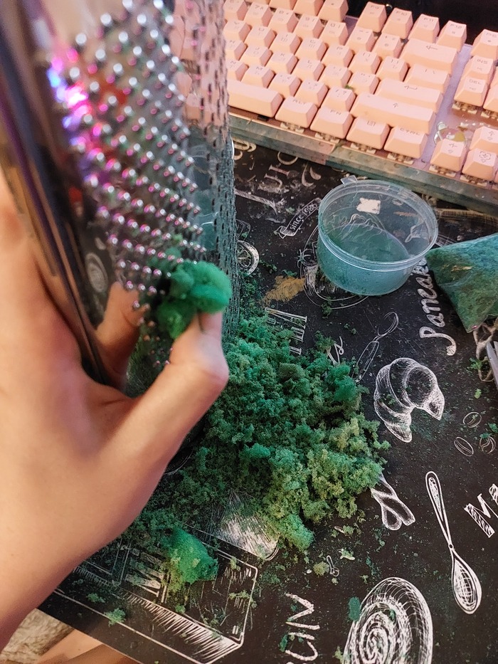 Для начала я покрыла "листвой" деревья. Из забавного: суперклей нагревается при контакте и губка у меня в какой-то момент даже слегка дымилась.
