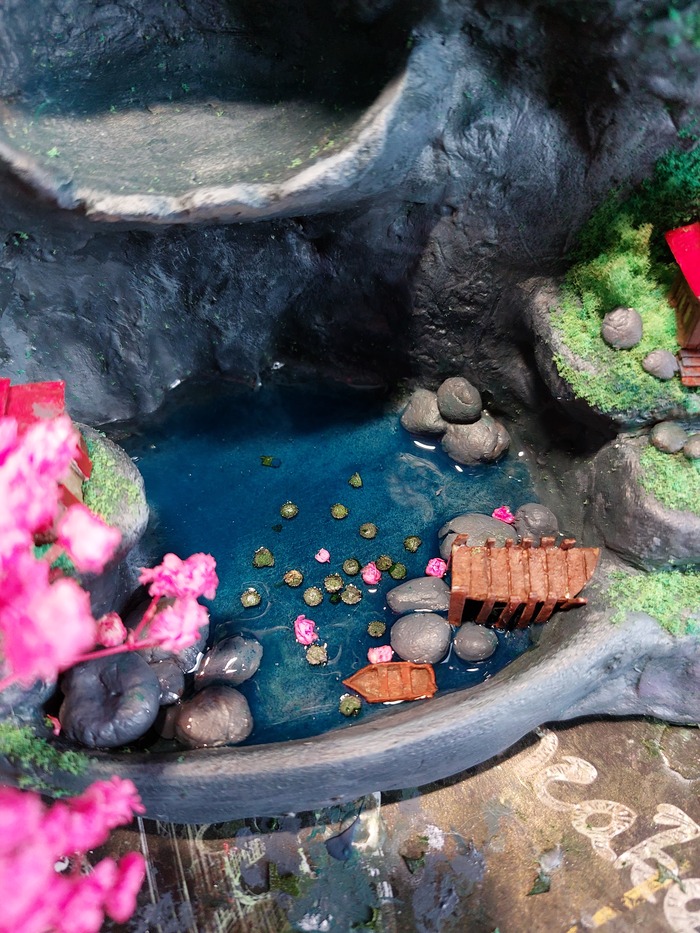 Затем я приклеила "траву" к горе, всё на несколько слоёв покрыла лаком, у меня он матовый и в баллончике, и прилепила домики с деревьями. После опять прошлась лаком. Оставалось сделать озеро. Тут я тоже впервые попробовала работать с такой штуковиной как УФ смола. Я не знала, как она прореагирует с акрилом, но вроде как всё хорошо. У меня в сухоцветах завалялись всякие листочки и цветочки, их я пустила на кувшинки.