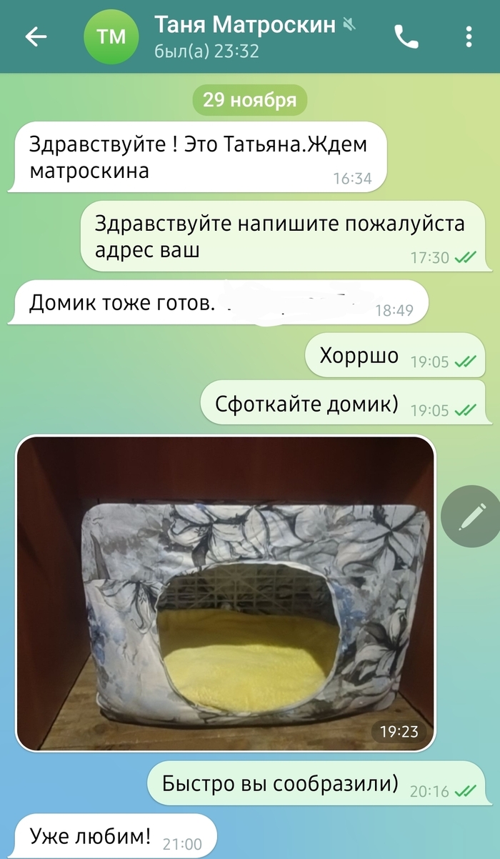 Туся дома спит на своей лежанке и, судя по фото-приветам, ее все очень даже устраивает