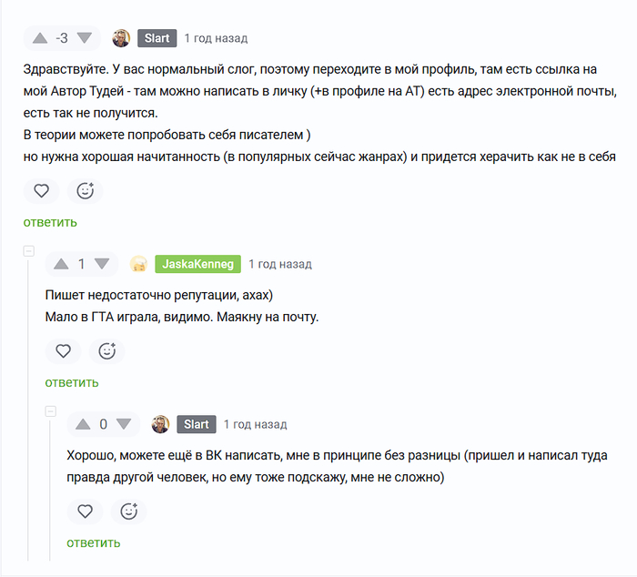 Мы разговорились, и так вышло, что я начал ему рассказывать как и что вообще устроено в писательском деле. А только чуть позже узнал, что ему на тот момент тоже требовалась помощь (а иначе, зачем бы он написал) (вот тут ссылка на тогдашнюю волну постов про сложности)