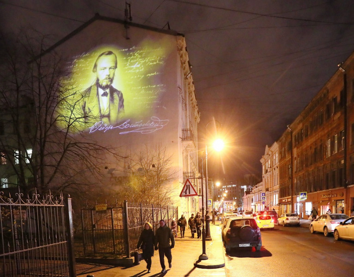 В Кузнечном переулке красуется световое граффити портрета Фёдора Достоевского.