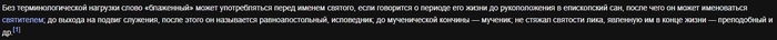 Тут мы узнаём, что блаженный это второе название юродивого в православии. И что-то тут ещё про католическую церковь, но это сейчас не актуально и я это опускаю. Кто такие юродивые уже известно. Но у слова "блаженный" есть ещё несколько значений: