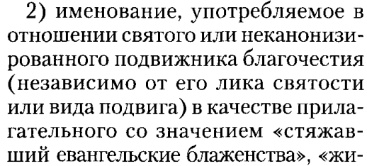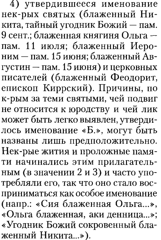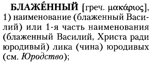 И вот пример употребления слова: блаженный Николай. Кто он: юродивый, благочестивый, праведник или счастливый? Или вообще ничего не значит? Если о значении русского слова "коса" можно догадаться по смыслу предложения, то здесь как? И таких слов-загадок с крайне размытым значением в православии предостаточно. Ладно. Смотрим что нам говорит "Православная энциклопедия".