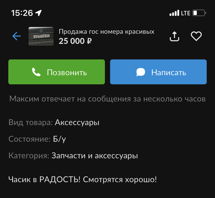 Наткнулся сегодня на объявление о продаже вот таких вот «красивых номеров». Даже не сразу понял в чем красота, а потом дошло, что видимо в буквах. И описание объявления тоже удивило: «Часик в радость. Смотрятся хорошо». Я так понял, что это разновидность приветствия «вечер в хату». Но могу ошибаться. К чему я это все веду? Что в голове у продавца и его потенциальных покупателей.