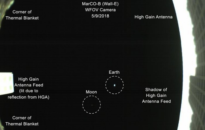 Речь идет об одном из пары кубсатов MarCO (Mars Cube One), запущенных (https://kiri2ll.livejournal.com/965028.html) NASA к красной планете вместе с миссией InSight. 9 мая камера наноспутника сделала снимок его корпуса с целью подтвердить корректное развертывание антенны. В качестве бонуса специалисты также получили изображения Земли и Луны. На тот момент, MarCO уже удалился от них более чем на миллион км.