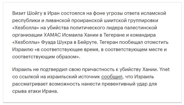Последний раз Шойгу приезжал в Иран в сентябре, когда он еще занимал пост министра обороны. Он провел ряд переговоров с военным руководством республики.