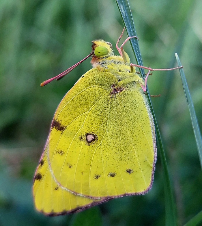Когда присмотришься, понимаешь почему. В их жизни совсем недавно случилось таинство метаморфоза - бабочка вышла из куколки и притаившись, расправила крылья. Нужно ей ещё немного времени, чтобы они окончательно окрепли. На фото бабочка-желтушка Colias sp. из семейства белянок, Конкретно вид не определил, не стал беспокоить будущую первоклассную летунью.